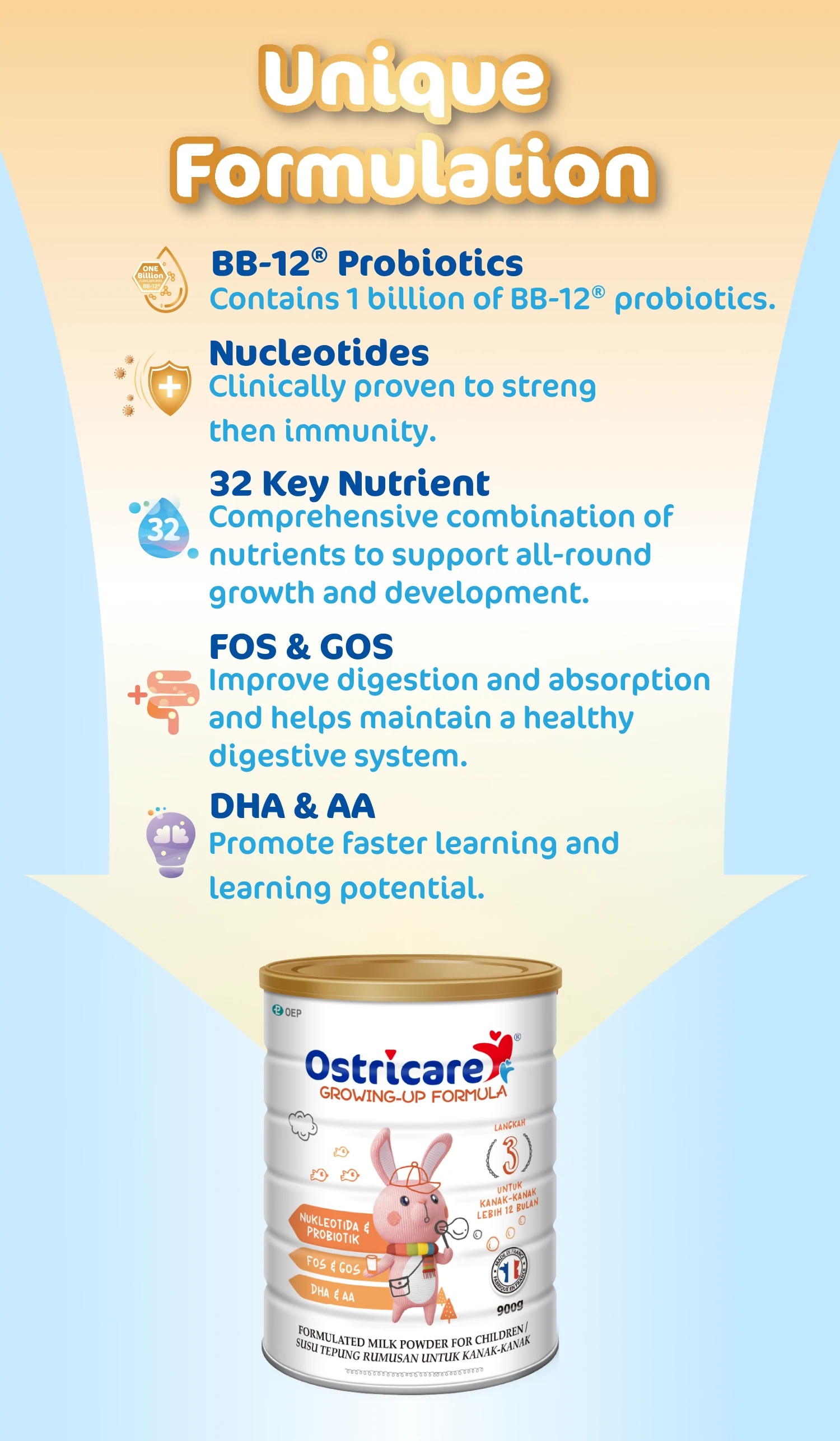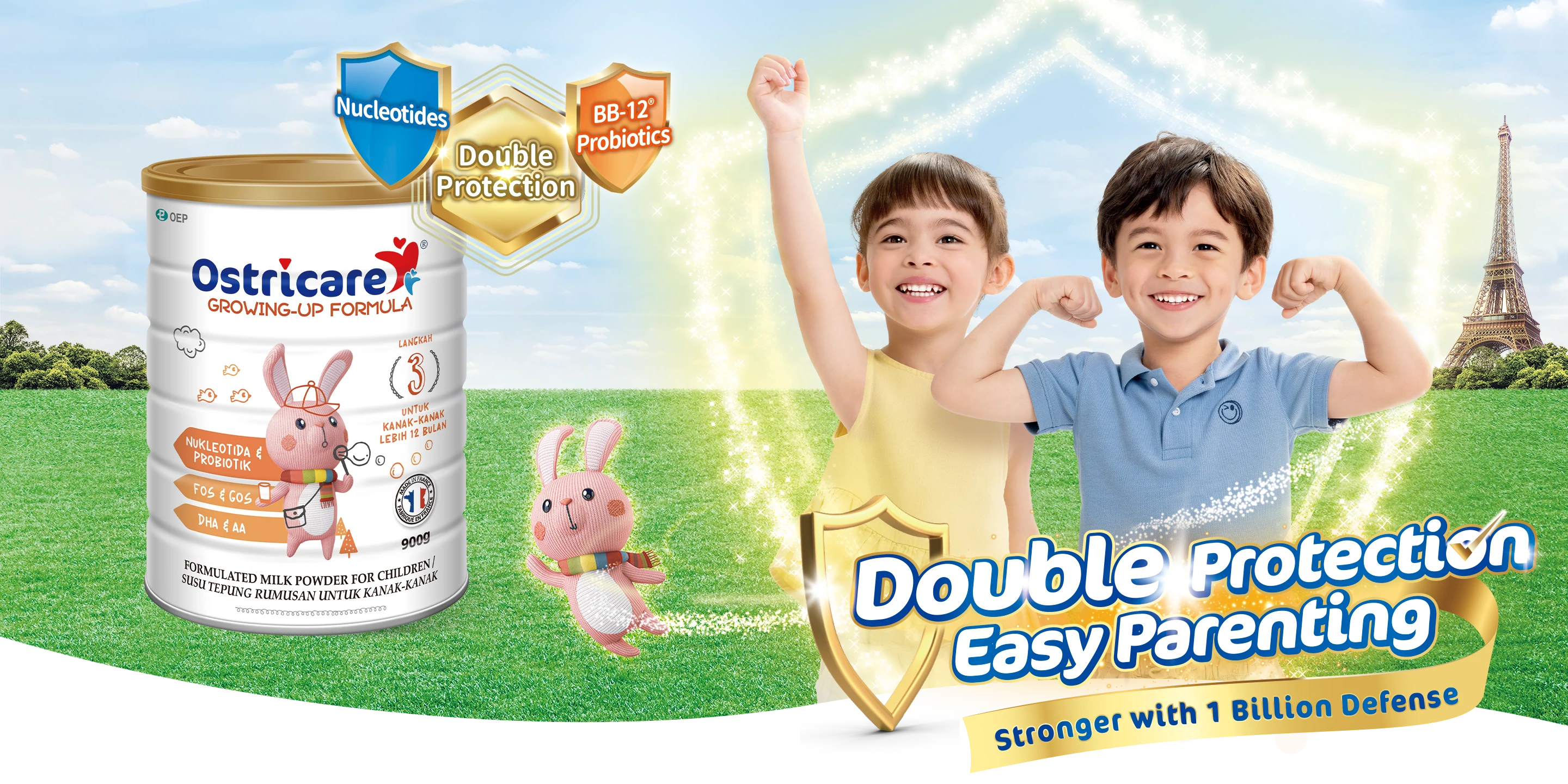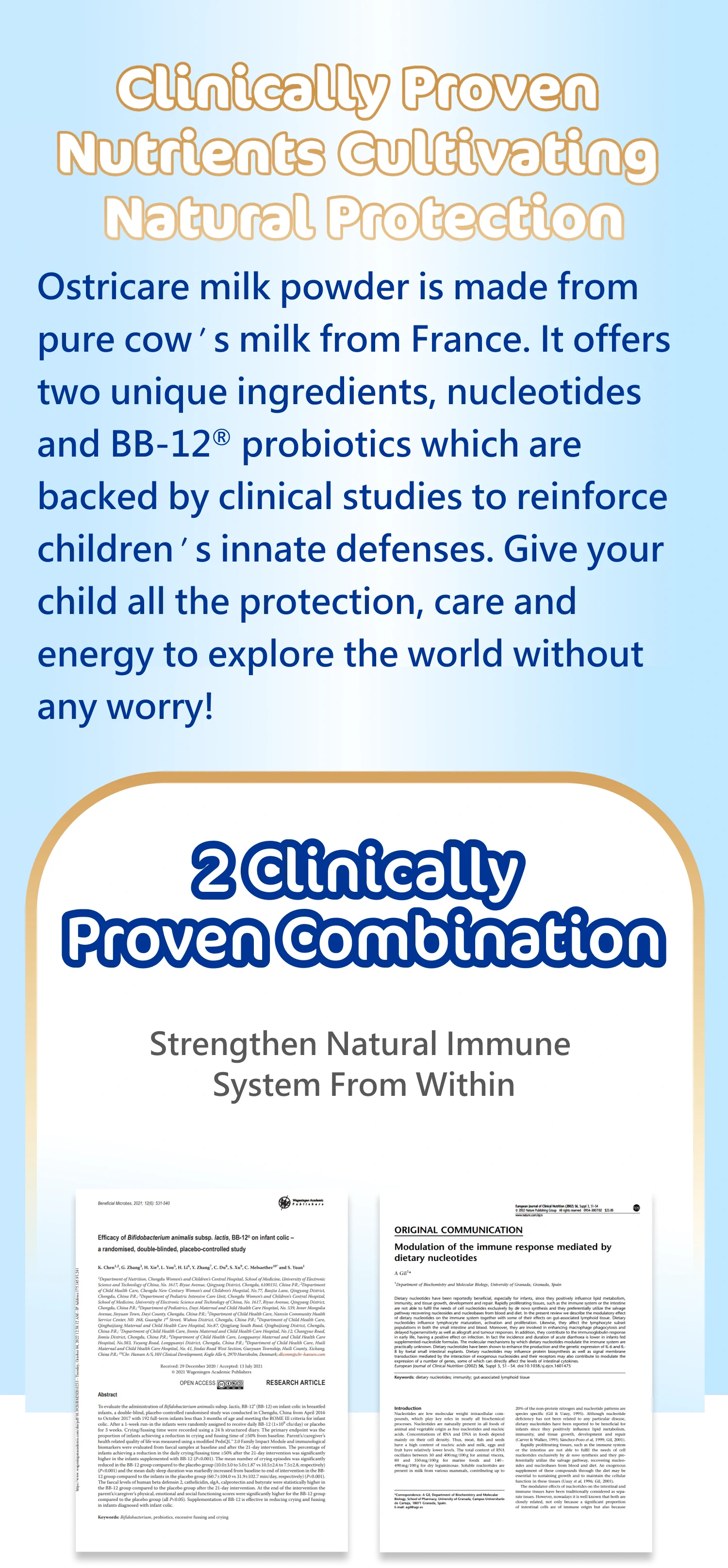 Ostricare milk powder is made from pure cow's milk from France. It offers two unique ingredients, nucleotides and BB-12® probiotics which are backed by clinical studies to reinforce children's innate defenses. Give your child all the protection, care and energy to explore the world without any worry!