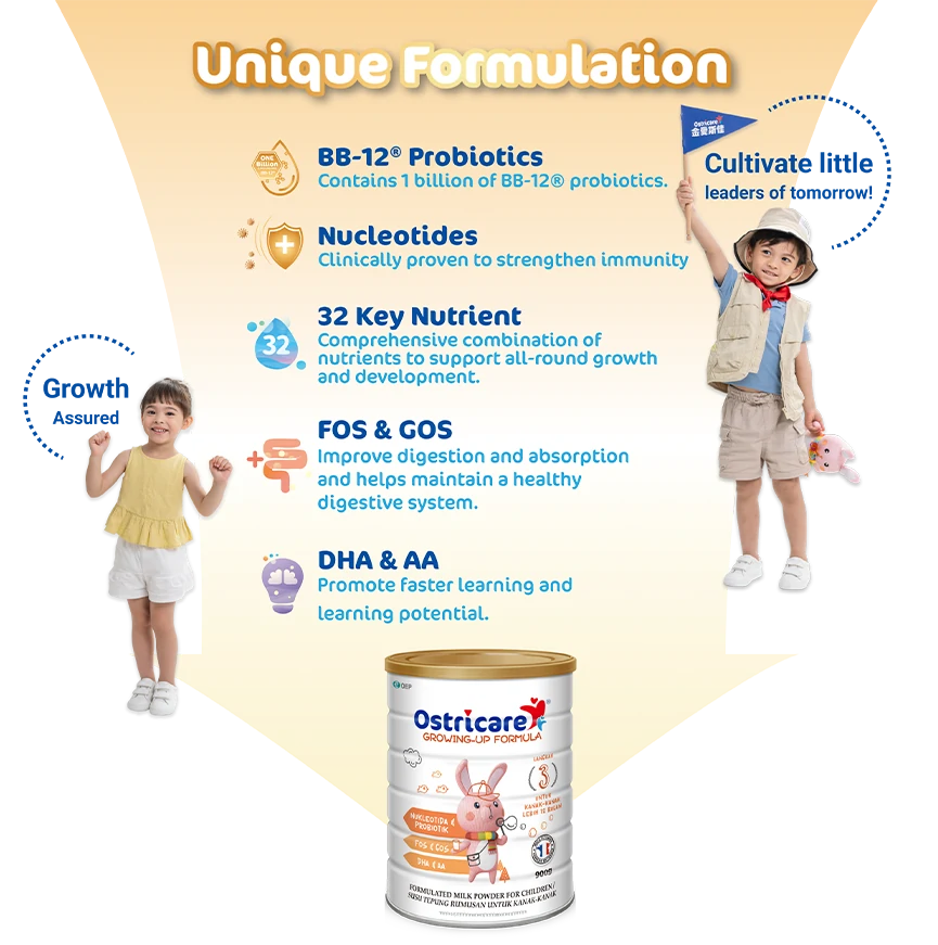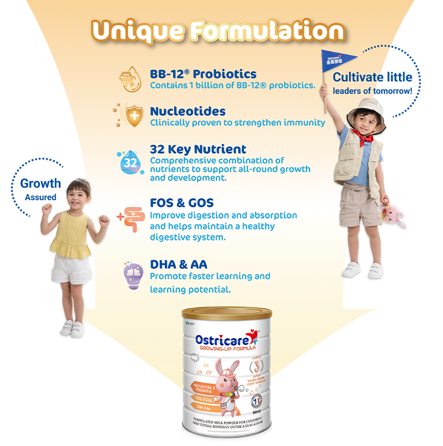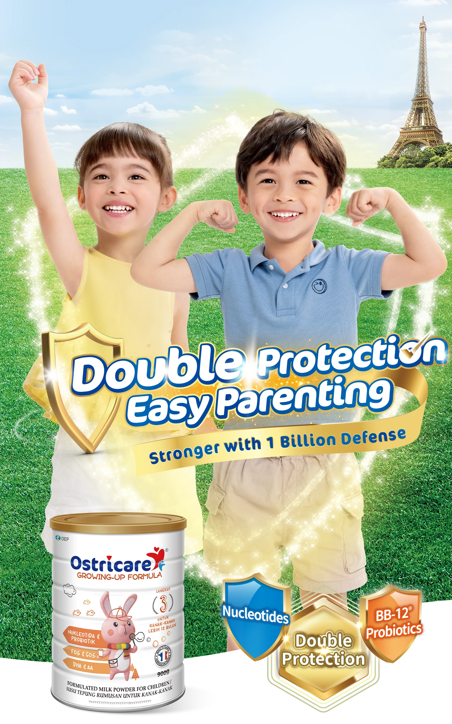 Ostricare milk powder is made from pure cow's milk from France. It offers two unique ingredients, nucleotides and BB-12® probiotics which are backed by clinical studies to reinforce children's innate defenses. Give your child all the protection, care and energy to explore the world without any worry!